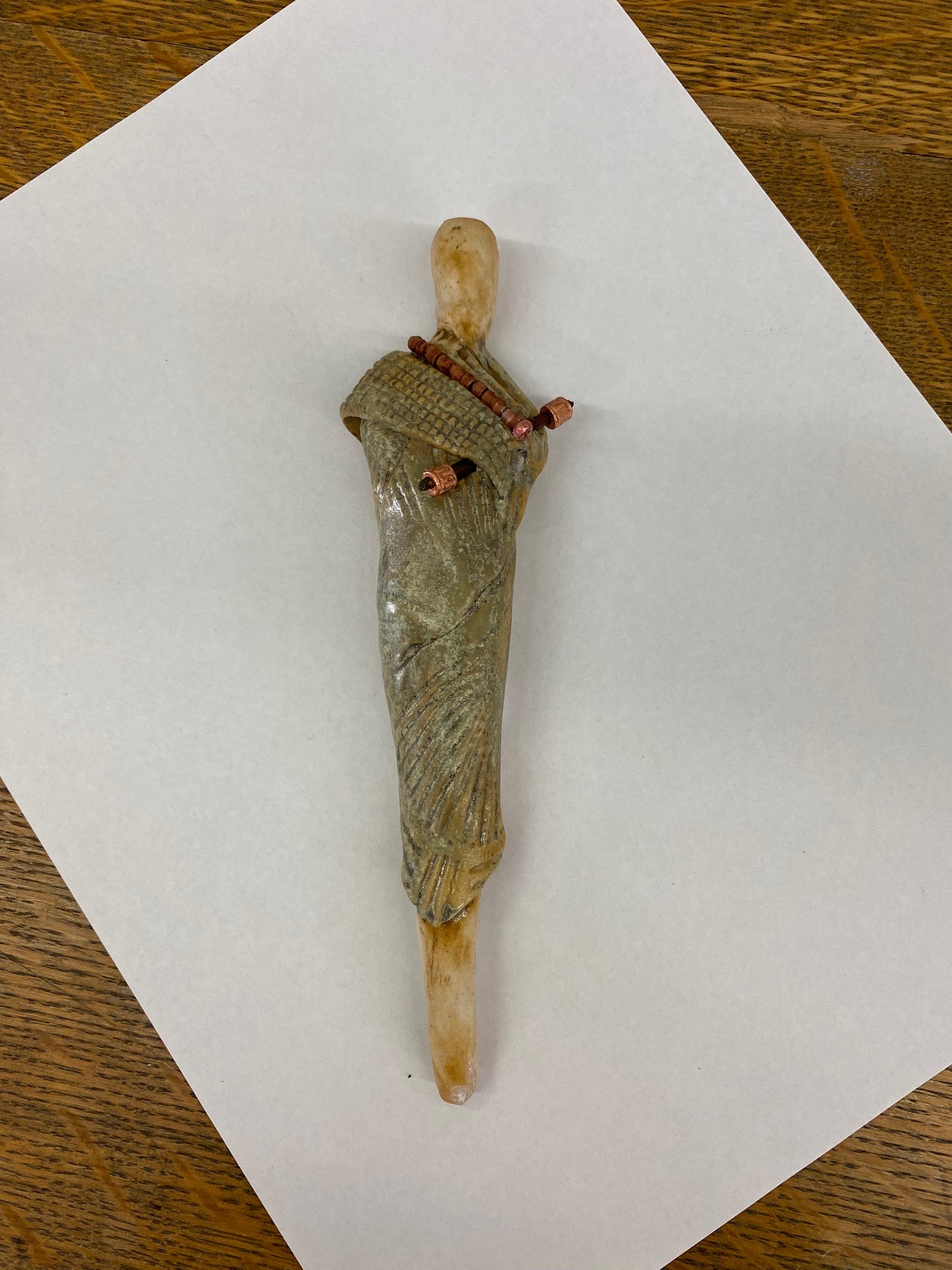 7.5 in. tall, oxide, tan glaze, bamboo cross body with copper beads